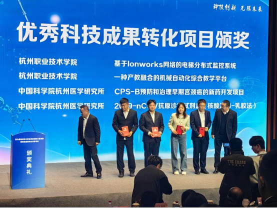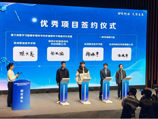 我校两项科技成果转化项目,基于深度学习图像处理技术的多维度种子质量评价装置、一种充电助行器,成功签约转化。两项科技成果转化项目,基于lonworks网络的电梯分布式监控系统、一种产教融合的机械自动化综合教学平台,荣获杭州市首届科技成果转化(钱塘站)优秀项目。