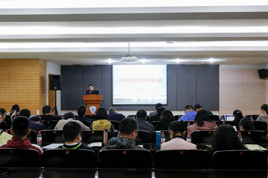 各党总支、直属党支部根据前期自评情况推荐党支部参加本次评审会。会上各申报党支部负责人从党建重点工作开展情况、党组织建设工作情况、宣传意识形态工作情况、党风廉政建设工作情况、工作成效及党建品牌建设情况等五个方面对2020年党支部工作进行汇报,参会代表对9个申报党支部进行现场无记名评分投票。根据上级要求五星级党支部比例最高不超过学校党支部总数的10%,最终将评出4个2020年度五星级党支部。