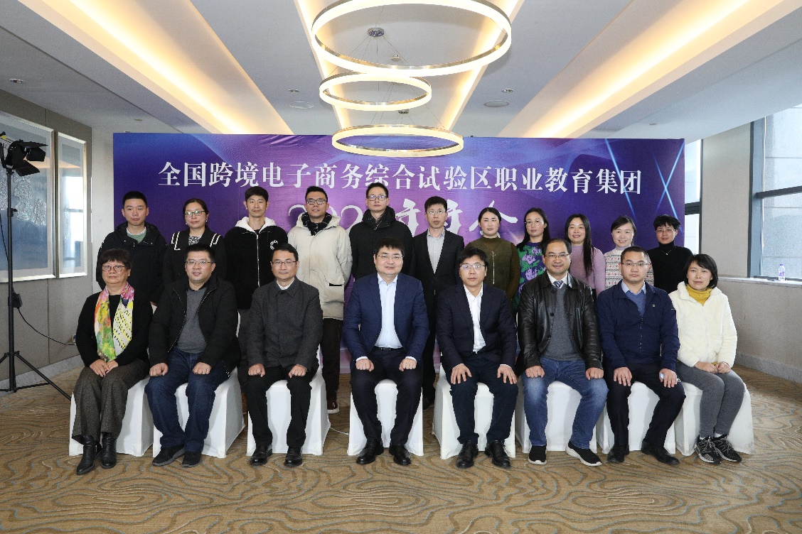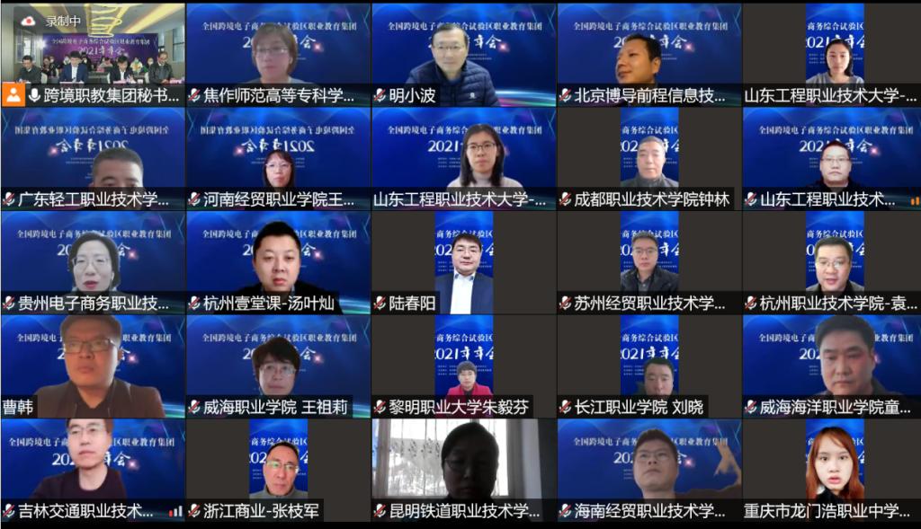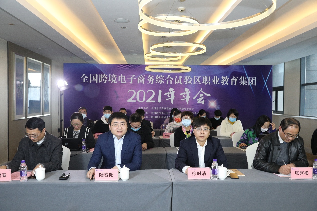 1月8日,全国跨境电子商务综合试验区职业教育集团2021年年会在我校召开。全国电子商务职业教育教学指导委员会常务副主任陆春阳,职教集团理事长、校长徐时清,职教集团秘书长、副校长楼晓春,商贸旅游学院负责人和跨境电子商务、电子商务专业教师代表在学校主会场参加会议。全国电子商务职业教育教学指导委员会副主任、浙江商业职业技术学院校长张宝忠,浙江省电子商务促进会会长卢成南,职教集团副理事长、厦门城市职业学院校长唐宁,北京博导前程信息技术股份有限公司董事长段建、杭州壹堂课信息科技有限公司总经理汤叶灿,以及来自职教集团成员单位、全国职业院校的校领导、院系负责人和专业骨干教师200余人在线上参加会议。会议由商贸旅游学院院长、职教集团常务副秘书长张赵根主持。