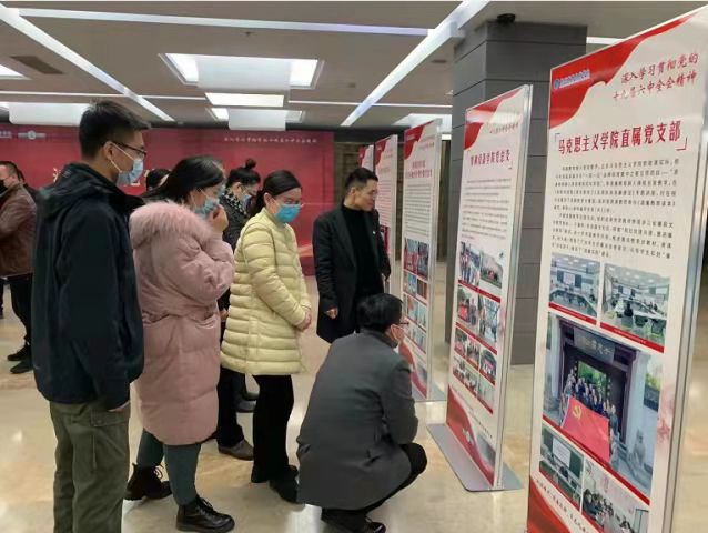 校党委书记金波、校党委副书记陈泉淼在相关职能部门负责人的陪同介绍下认真观看了展厅内的每一块展板。各党总支、直属党支部分批分时段参观了成果展。