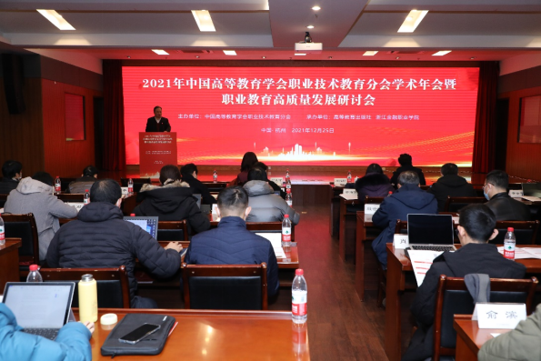 12月25日,2021年中国高等教育学会职业技术教育分会学术年会暨职业教育高质量发展研讨会以线上+线下的方式在杭举行。教育部职业教育与成人教育司副司长林宇,国务院教育督导委员会总督学顾问、中国高等教育学会原会长瞿振元,中国高等教育学会副秘书长王小梅,高等教育出版社副总编辑贾瑞武等出席会议,职业技术教育分会理事长、副理事长及会员单位组织集中观看。我校党委书记、中国高等教育学会职业技术教育分会监事长金波出席大会,并应邀主持创新发展研讨版块。