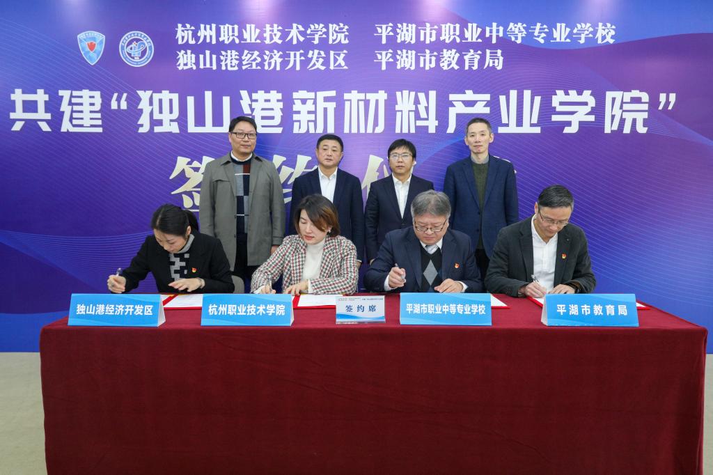 12月1日上午,杭州职业技术学院、独山港经济开发区、平湖市职业中等专业学校、平湖市教育局四方共建“独山港新材料产业学院”签约仪式在我校行政楼121会议室隆重举行。平湖市人民政府副市长方晓烈、办公室副主任冯超,平湖市教育局党委书记、局长王郁春,副局长张晓松、党政办主任王献,平湖市独山港镇副镇长何叶芳,平湖市职业中等专业学校党委书记、校长姚雁,副校长张跃平,新凤鸣集团浙江独山能源有限公司副总经理左东,浙江卫星能源有限公司集团人力总监柯常杰等领导出席签约仪式。我校校长徐时清,副校长金徐伟、楼晓春出席签约仪式。签约仪式由楼晓春主持。