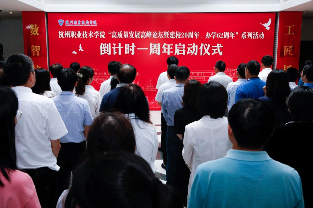 薪火相传六十载,荣耀见证新时代。10月15日下午,杭州职业技术学院“高质量发展高峰论坛暨建校20周年、办学62周年”系列活动一周年倒计时启动仪式在学生活动中心一楼大厅隆重举行。学校党政领导班子成员金波、徐时清、陈泉淼、金徐伟、楼晓春、程利群、麻朝晖,全体处级以上干部、离退休教职工代表、教师代表、学生代表、校友代表参加。启动仪式由金徐伟主持。