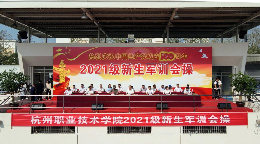 分列式结束后,同学们进行了气势恢宏的汇报表演。擒敌拳方队率先登场,他们脸画迷彩,在烟雾缭绕中搜索前行,他们目标明确地持枪挺进,体现出杭职学子勇往直前的精神风貌;棍术表演方队,他们动作迅捷勇猛、刚劲有力,展现了杭职学子刚猛豪迈的铮铮铁骨;军体拳方队气势恢宏,精神饱满,眼神坚定,身姿敏捷,彰显了当代青年的豪情万丈。当观众还在回味军事科目汇演的精彩时,花样方阵的表演将本次军训会演推向了高潮。以人体数字时钟倒计时的方式敲响了队形变幻表演环节,同学们一气呵成摆出的“党徽” “建党100周年”“我爱杭职”等图案在骄阳下熠熠生辉,“请党放心,强国有我”的口号,让人热血沸腾。手语操表演《感恩的心》,以无声的手语表演渗透着有声的感恩之情,同学们高喊“感党恩,听党话,跟党走”的口号,赢得在场师生的热烈掌声。