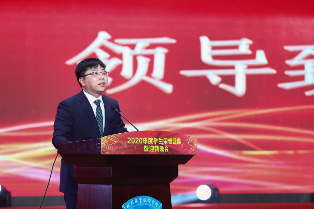整场活动以灯光秀、舞蹈《密林狮王》拉开序幕,2020年度学生荣誉盛典和迎新晚会线上线下同步进行。徐时清首先向全体师生致以亲切问候,他强调,2020年极不平凡、催人奋进、守正创新、勇攀高峰、成绩斐然。这一年,我校全力推进国家“双高校”建设,产教融合校企合作多点开花、再结硕果;高考录取分数一路飘红、连年飙升,毕业生留杭率连续四年位列全省高职首位;杭职学子在国家、省级各类大赛上摘金夺银、尽显风采,受到省市领导的充分肯定。他强调:科技创新,职业院校同样大有作为、你我皆可有为;招生就业,职业院校同样尽显芬芳、倍受青睐;高端人才培养,职业院校同样别样精彩、技高一筹。