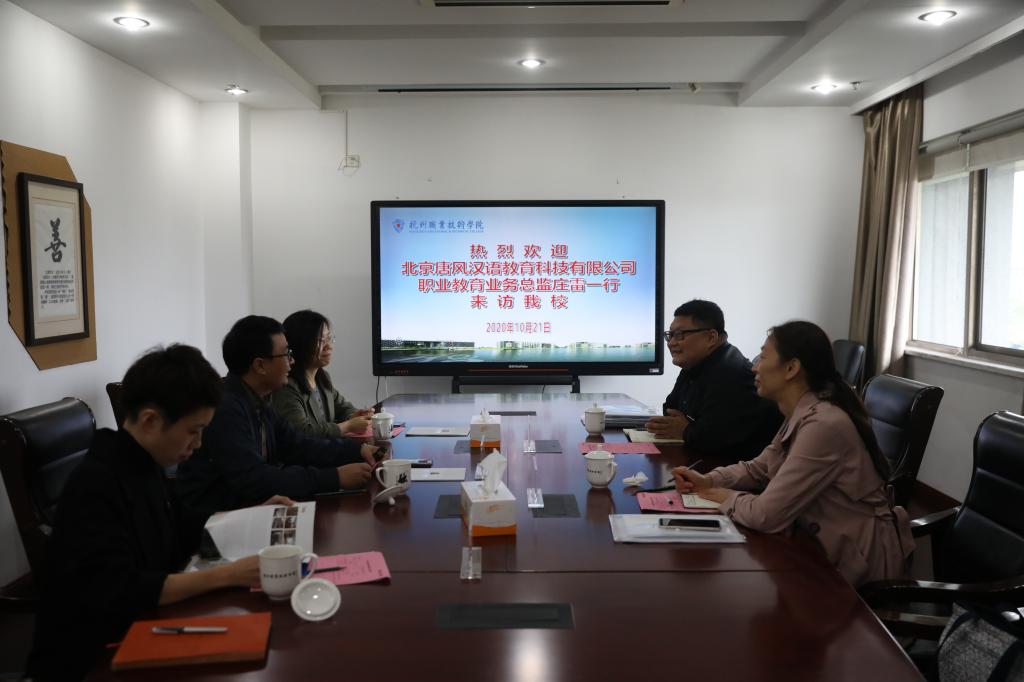会上,楼晓春对庄雷的到来表示热烈欢迎,并从概说杭职、高职办学国际化之“类型思考”、杭职办学国际化之“引进来”,以及杭职办学国际化之“走出去”四个方面简要介绍了学校的基本概况及国际化建设理念,并表示学校将积极开展对外职业教育交流与合作,服务浙江企业“走出去”,助力“一带一路”建设。庄雷简要介绍了北京唐风汉语教育科技有限公司的发展历程和院校国际化项目合作内容,他表示希望通过深度合作,助力院校办学国际化建设。会上,双方就优质教学资源输出、中资企业员工“技能+文化”培训、留学生培养、国际技能大赛承办等内容进行了深入地交流。