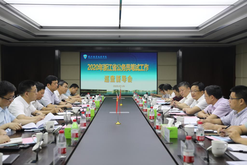 实地巡查后,督导组一行在行政楼第一会议室听取了情况汇报。仰中旻汇报了公务员笔试整体工作情况,市人事考试院院长钱斌汇报了考试考务工作情况,市卫生健康委副主任王旭初汇报了疫情防控工作情况。金波代表学校党委汇报了杭职院考点的考务、防疫等前期筹备情况,表示将认真落实省委实地检查督导的指示要求,聚全校之力、集全校之智,全力以赴交出满意答卷。会上,省委组织部公务员二处处长樊必成,省人力社保厅二级巡视员、省人事考试院院长朱树民分别从疫情防控和考务组织等方面提出了更高、更细的要求。