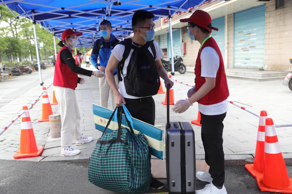 报到当天,各部门、各二级学院通力合作,各项工作平顺有序。报到通道外,保卫人员在属地交警和公安的支持下,引导家长车辆即停即走,教职工车辆有序进出校园;报到通道内,每条通道的地面上都清晰标注了等候线,学生保持前后1米以上安全间距,排队进入候检区,经过严格的亮码、测温等程序后依次进入校园;学生公寓内,学生在工作人员引导下,规范开展二次亮码、测温和消毒等相关工作;报到环节中,学生出现发热等异常情况,立即转至二次测温区由校医护人员进行专业的应急处置;与此同时,党员教师志愿者和前期返校的学生志愿者们为报到学生提供了暖心服务,及时提醒返校学生提前做好报到流程的材料准备、校验,帮助返校学生一起搬运行李,确保了报到通道的顺畅。