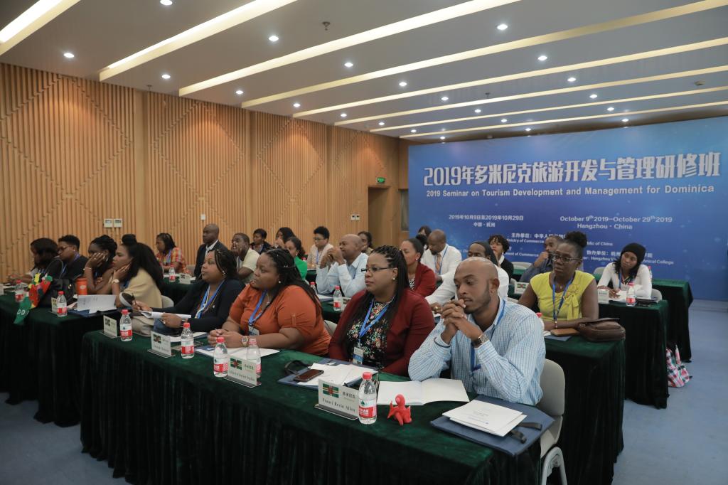 10月19日上午,2019多米尼克旅游开发与管理研修班开班仪式在我校图书馆第七会议室隆重举行。浙江省商务厅外经处调研员范爱华、浙江省商务认证中心主任陈永红、我校副校长楼晓春,国际交流合作处、商贸旅游学院、继续教育学院相关负责人,以及来自多米尼克的24名学员共同参加仪式。