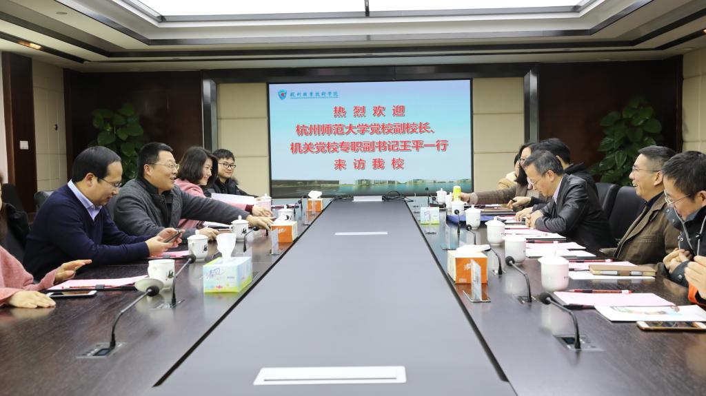 3月8日上午,杭州师范大学党校副校长、机关党委专职副书记王平一行7人来访我校。我校党委副书记陈泉淼、纪委书记沈威、副校长金徐伟,党政办、学工部、后勤保障处相关负责人参与接待。