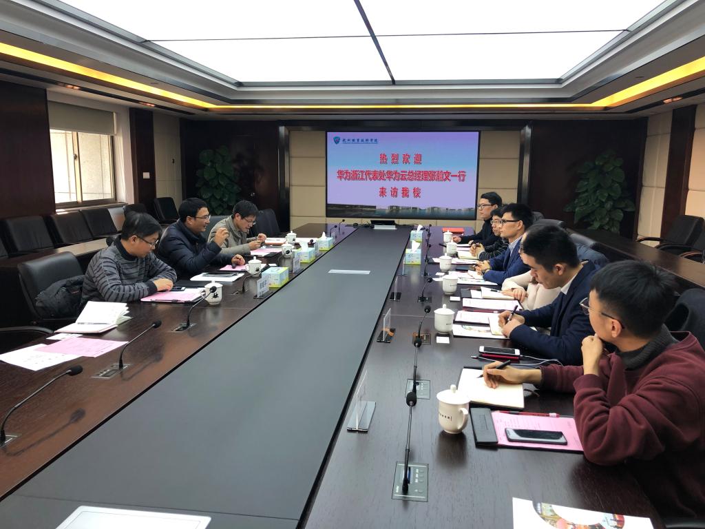 1月23日下午,华为浙江代表处华为云总经理张瀚文等一行六人来访我校。我校副校长楼晓春,信息工程学院、图信中心、国际交流合作处相关负责人参与接待。