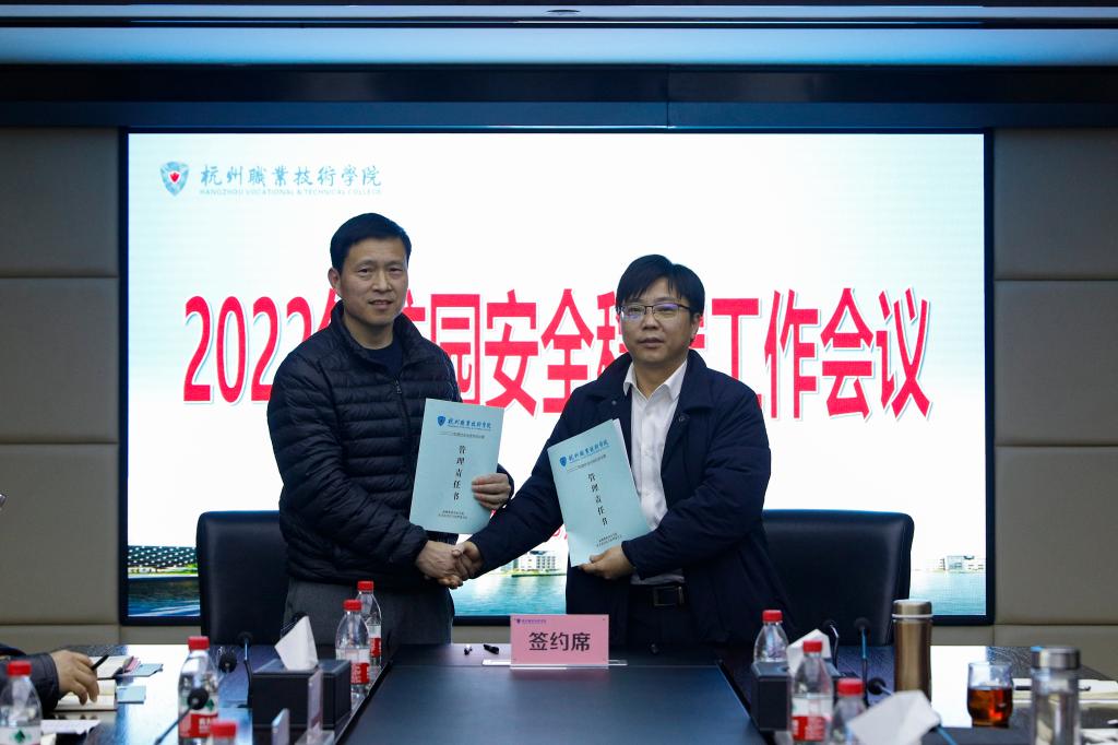 会上,二级学院代表友嘉智能制造学院、商贸旅游学院作交流发言。校长徐时清与部门、二级学院代表签订《杭州职业技术学院 2022 年度社会治安综合治理管理责任书》。