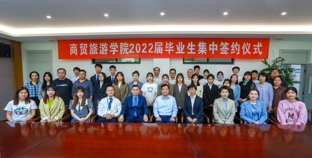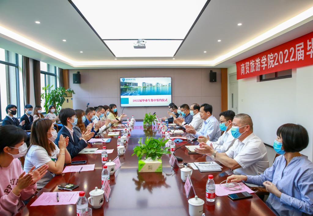 为应对“最难”就业季,深入贯彻落实党中央、国务院关于“六保”“六稳”决策部署,扎实推进访企拓岗促就业专项行动,全力做好2022届毕业生就业工作,最大限度地实现疫情背景下毕业生的充分就业、高质量就业。5月4日下午,商贸旅游学院在8318会议室举行毕业生集中签约仪式。万科物业服务有限公司战区代表处副总经理朱卫红、人力资源部负责人周强,融创物业服务集团有限公司杭州大区招聘负责人张悦,圣奥科技股份有限公司人力资源总监唐睿丽,顾家集团杭州分公司副总经理戎燕,杭州郝姆斯食品有限公司客服中心资源管理部负责人张琴,杭州为一品牌管理有限公司总经理曾瑞芳,杭州精彩财务咨询有限公司总经理黄欣欣,杭州振乡文旅发展有限公司副总经理赵海舟,学校党委书记金波,党政办、学工部、商贸旅游学院相关负责人,以及商贸旅游学院各专业负责人、学工办辅导员和20余名毕业生代表参加仪式。