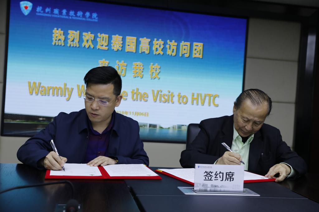 首先,来宾一行观看了学校宣传短片和南非留学生视频集锦。随后,贾文胜对杨金泉一行表示热烈欢迎,并从概说杭职、演绎杭职、精彩杭职、发展杭职等四个方面详细汇报了我校的办学理念、办学特色、办学成效和发展目标。随后,杨金泉介绍了泰国高等基本概况,并分别就格乐大学和博仁大学的专业、师资、学校建设等做了具体介绍。他对我校极具特色的跨界合作模式给予了高度赞赏,对我校鲜明的办学特色和成效给予了高度评价,对推进与我校的合作产生了浓厚的兴趣。