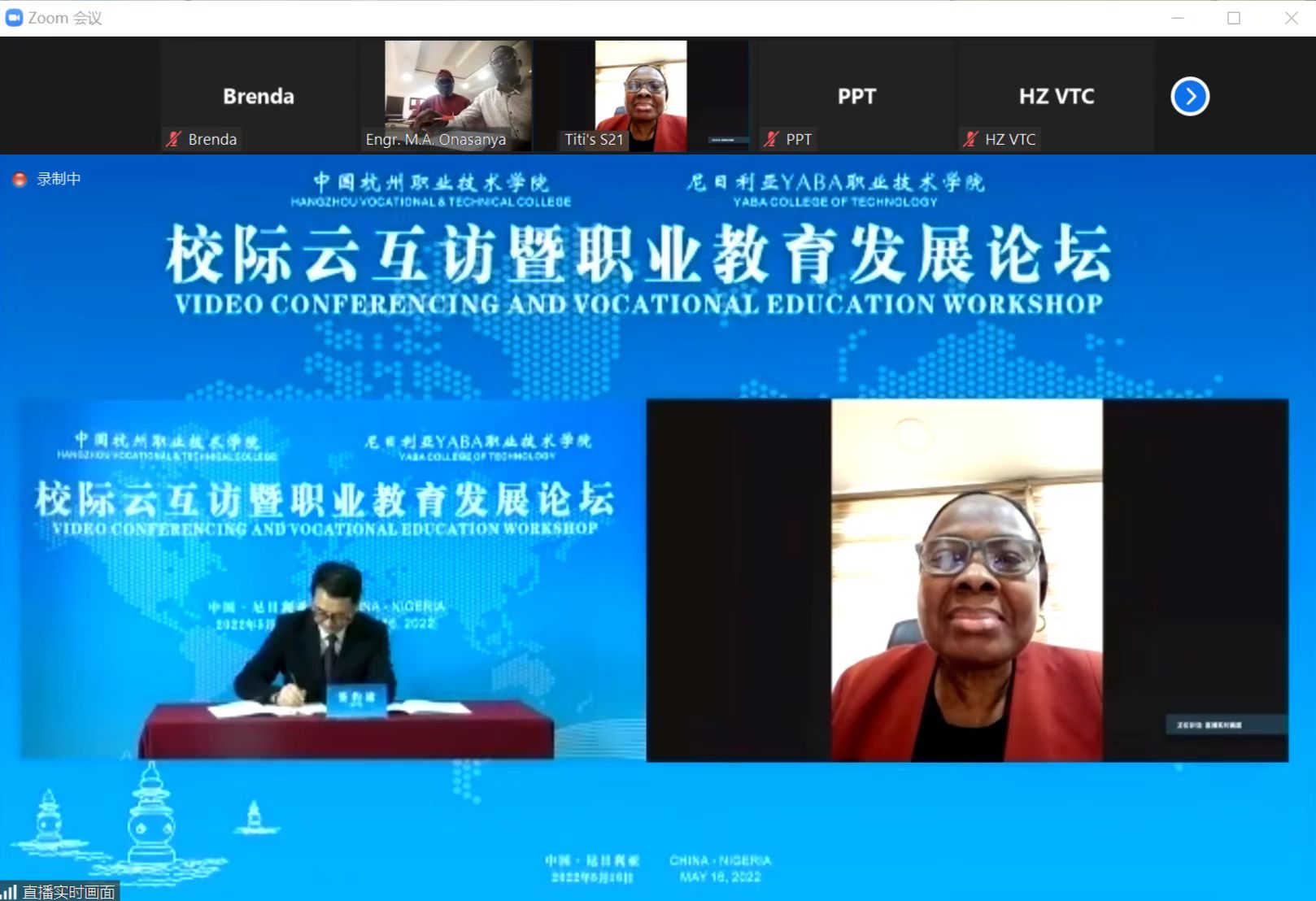 5月16日,我校与尼日利亚YABA职业技术学院校际云互访暨职业教育发展论坛成功举行。YABA职业技术学院副校长Titilayo Ukabam、教务长Sikiru Momodu、机电学院院长Mobolaji Onasanya, 我校副校长楼晓春和国际交流合作处、友嘉智能制造学院、特种设备学院负责人及两校相关专业教师参会,会议以在线形式召开。