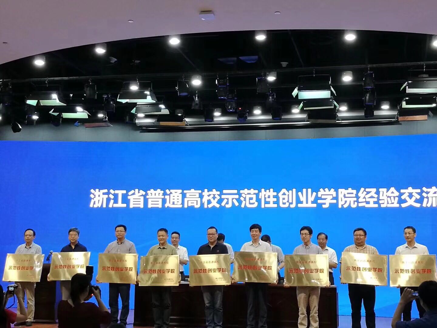 会上,省教育厅副厅长朱鑫杰宣读了省普通高校示范性创业学院的评选结果,我校喜获“浙江省普通高校示范性创业学院”称号,成为全省首批获此称号的34所高校之一。省委教育工委书记、省教育厅厅长郭华巍亲自为我校颁发了奖牌。