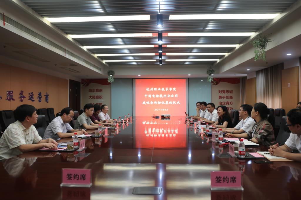 7月3日下午,杭职院与中国电信杭州分公司战略合作协议签约仪式在电信大厦31楼第六会议室隆重召开。我校校长贾文胜、副校长张洪宪以及党政办、宣传部、专业建设指导处、图信中心等相关负责人,杭州电信分公司总经理章晓钫、副总经理周臣武以及下沙分局、校园中心相关负责人共同出席会议。会议由杭州电信分公司校园中心经理傅卫英主持。