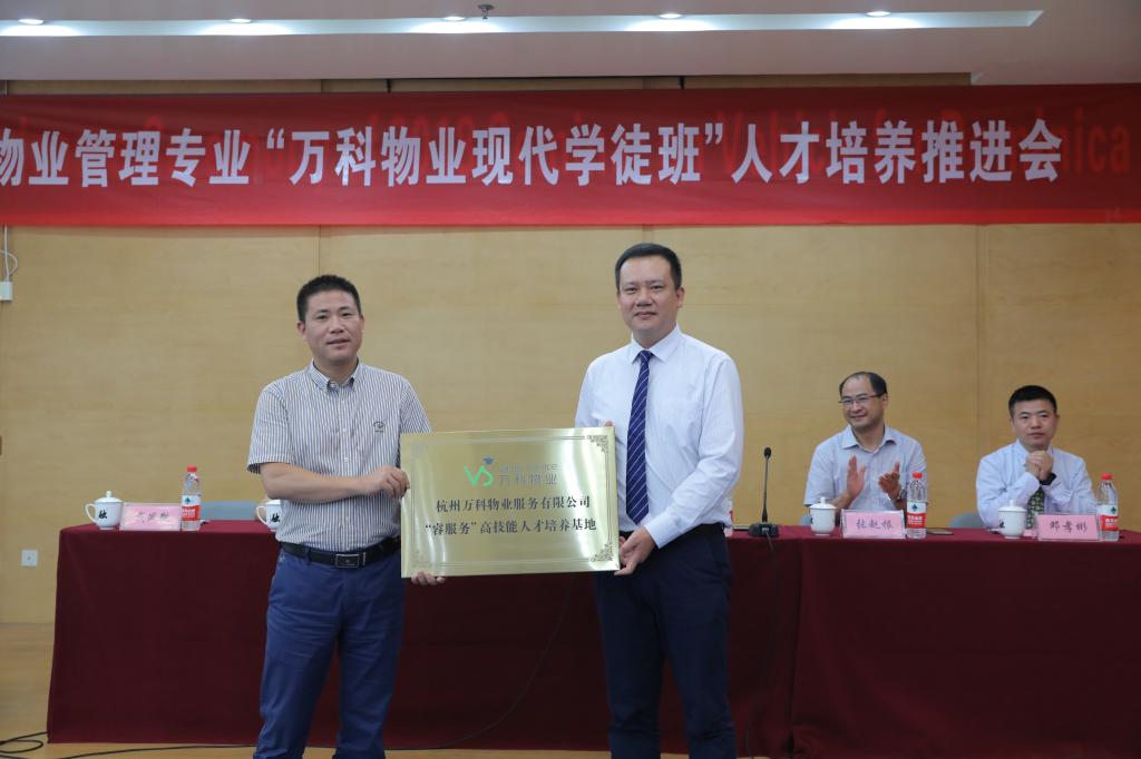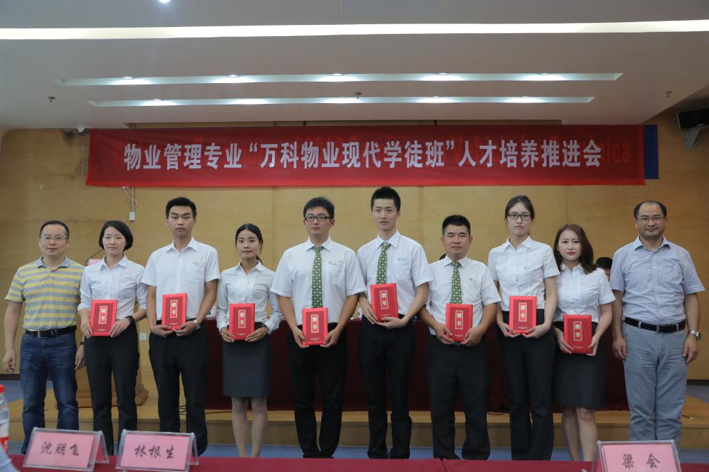 会上,陈加明和闫凯代表校企双方签署了新一轮校企合作协议。张赵根宣读了“成立万科学徒班校企合作工作委员会”的文件,闫凯代表万科物业向学生代表捐赠了5万元“万科学徒班”奖学金。之后,校企双方进行了相互授牌仪式,并举行了企业导师聘任、签订“师徒结对”协议和拜师仪式。导师代表邓孝彬和学徒代表张孟凯分别进行了发言。