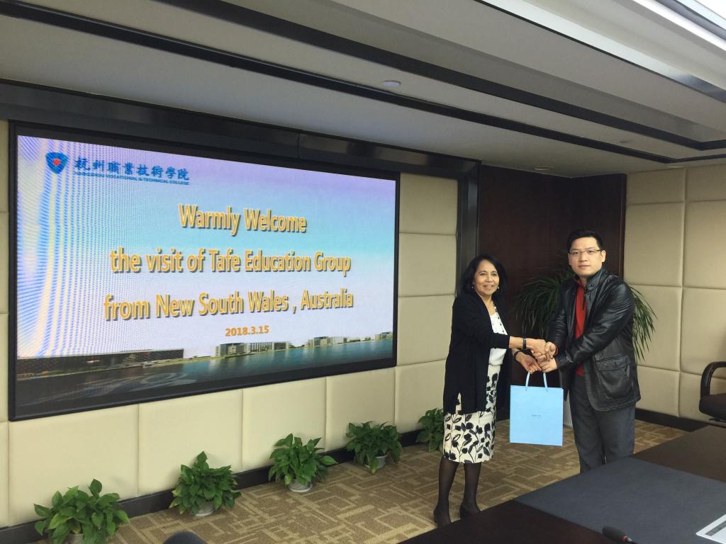 方字梅一行观看了学校宣传影片和金砖国家技能发展与技术创新大赛视频资料。贾文胜向来宾介绍了杭州概貌,学校办学历史、发展现状及国际化办学情况。他表示,杭职院始终坚持开放办学,坚持服务区域经济社会发展,希望与澳大利亚教育部门和高等院校建立长期、稳定、互赢的合作关系,通过“名校名院名所”建设,不断提高国际化办学水平,为杭州加快建设独特韵味别样精彩世界名城提供智力支撑。
