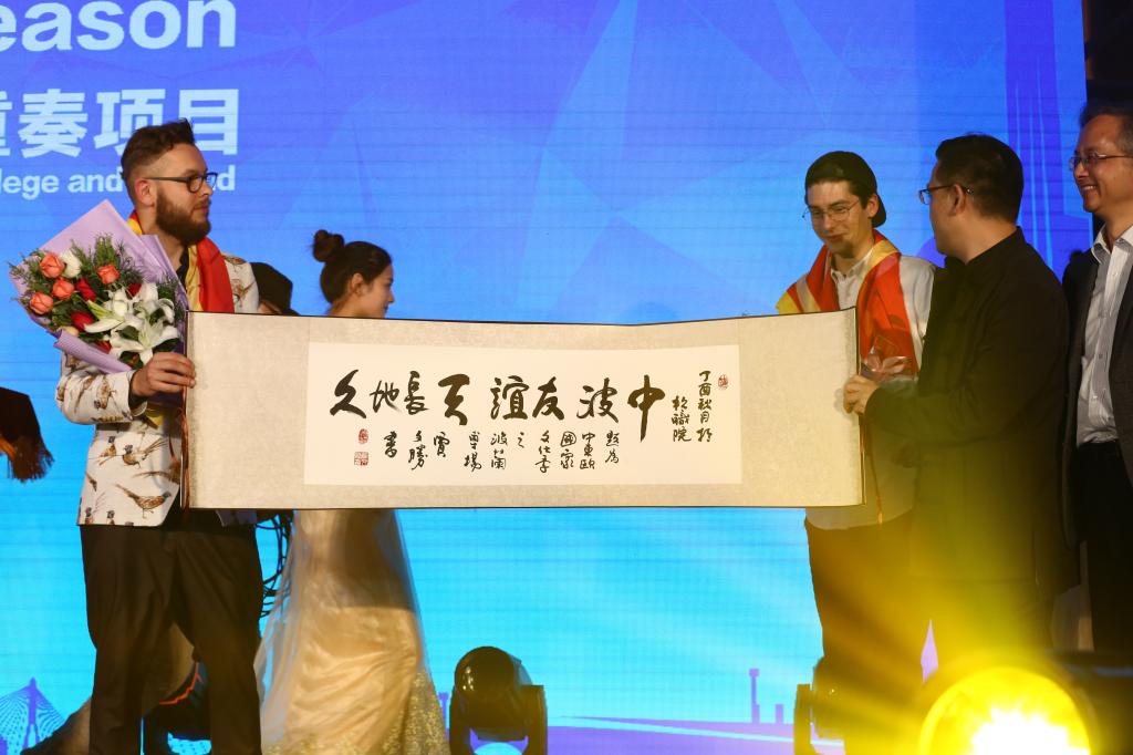 演出结束后,杨建华副秘书长、安蓉泉书记和贾文胜校长一起上台向波兰演职人员献上了鲜花,给他们披上了由我校达利女装学院同学们设计的丝巾,并赠送了由贾文胜校长亲笔题写的“中波友谊天长地久”字幅。到场来宾与中波双方演职人员一起合影留恋,将演出现场氛围推向高潮。同学们久久不肯散去,纷纷登台与波兰演职人员自拍合影、签名留念,友好氛围令人动容。