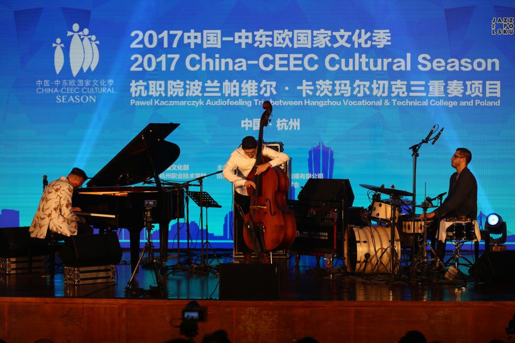当晚,帕维尔•卡茨玛尔切克三重奏带来了Crazy Love、Birthday Song、Something Personal等六首爵士音乐,婉转柔长的钢琴声配上低音精灵般贝斯,激越铿锵的军鼓,现场向全体来宾奉上了一场爵士乐盛宴,令观众们大饱耳福。而由我校艺术团的二十余名学生也向波兰乐者们献上了中国古典舞《踏歌》和阿卡贝拉版《外婆的澎湖湾》,向全体来宾展现了中国传统文化的魅力和杭职学生的艺术才华。