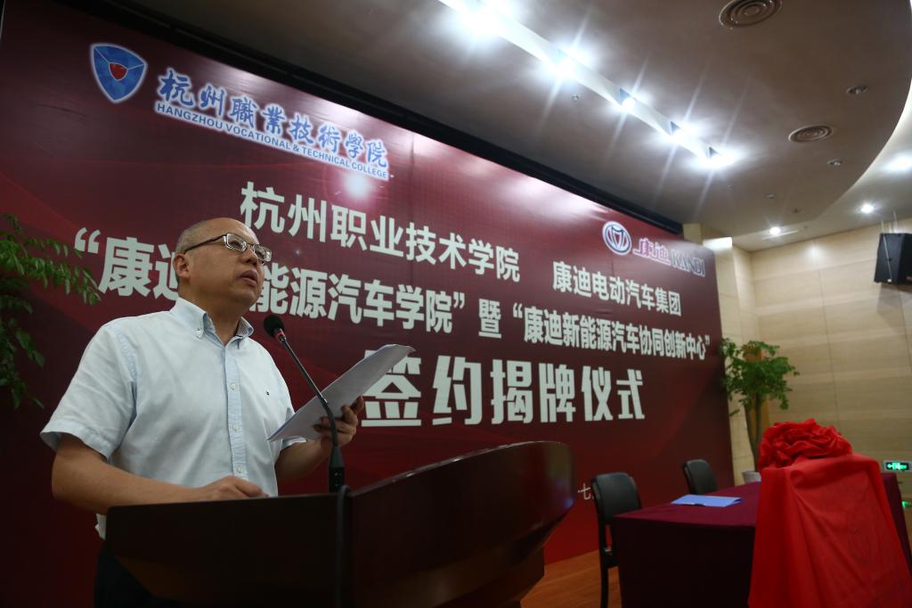 胡晓明在致辞中表示,康迪电动汽车集团正沿着“四化”——电动化、智能化、网联化、共享化四大方向发展,引领着汽车的变革,代表着新能源汽车新的发展趋势。此次与杭州职业技术学院的合作,是一个新的起点,希望能借此机会,为全国新能源汽车行业人才培养出力,向社会输送出更多的新能源汽车人才,更好地推动新能源汽车行业的发展。
