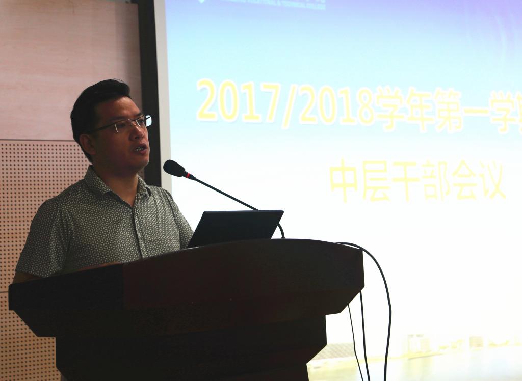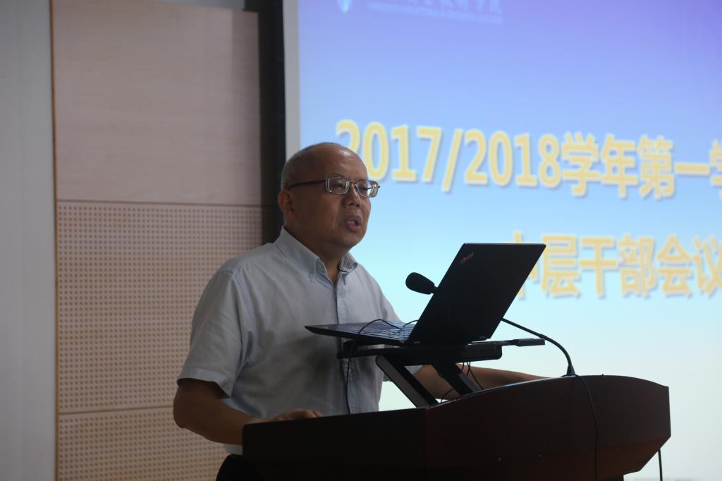 9月8日,学校在行政楼第四会议室召开2017/2018学年第一学期期初中层干部会议。学校党政领导班子成员,全体处级干部、资产经营公司负责人及常驻学校的二级学院企业方负责人出席会议。本次大会主题是部署2017年下半年主要工作,学习领导重要讲话精神和文件精神,研讨2017年下半年党政工作补充要点(征求意见稿)。