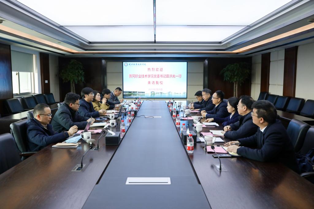 2月20日上午,黄冈职业技术学院党委书记田洪光一行6人来访我校。我校校长徐时清、副校长金徐伟以及办公室、教务处、双高办、继教院负责人参与接待。