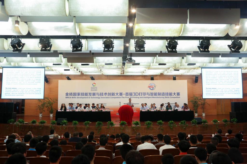 由教育部、工信部指导,金砖国家工商理事会主办,金砖国家工商理事会技能发展工作组、北京企学研教育科技研究院、杭州职业技术学院、杭州市公共实训基地、武汉华中数控股份有限公司、广州中望龙腾软件股份有限公司、北京太尔时代科技有限公司、北京三维天下科技股份有限公司、北京嘉克新兴科技有限公司联合承办的金砖国家技能发展与技术创新大赛—首届3D打印与智能制造技能大赛总决赛于824日在我校隆重开幕。