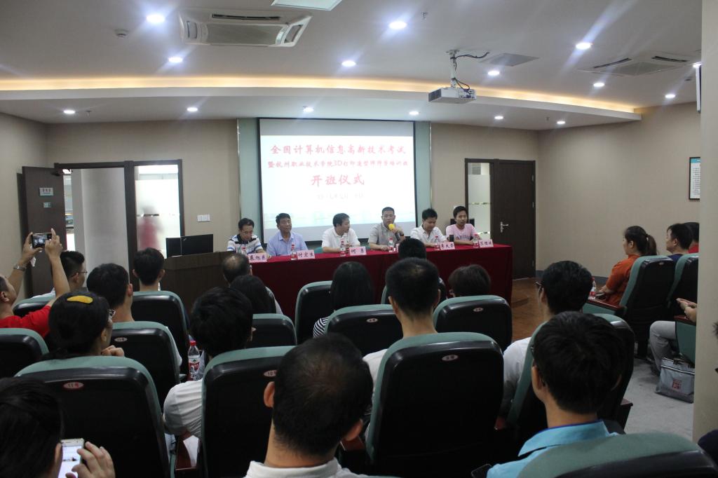 7 20 上午,由我校承办的“3D打印造型师师资认证培训班”在友嘉机电学院二楼简报室举行了开班仪式。杭州职业技术学院副校长陈加明、北京企学研教育科技研究院执行院长何勇、清华大学基础工业训练中心客座教授付宏生、北京三维天下科技股份有限公司首席设计师李大荣以及来自全国各地近50名学员出席开班仪式.友嘉机电学院院长裘旭东主持仪式。