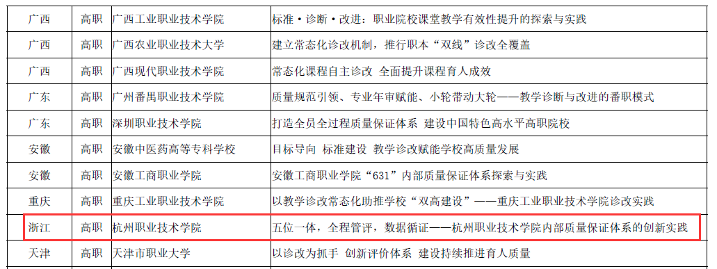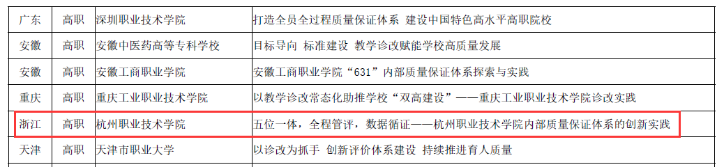 近日,中国教育科学研究院职业教育与继续教育研究所下发了《关于展示2022年职业院校教学诊断与改进典型案例的通知》,学校申报的《五位一体,全程管评,数据循证-杭州职业技术学院内部质量保证体系的创新实践》成功入选全国职教诊改典型案例,同时入编《2022年职业院校教学诊断与改进典型案例集》报送教育部,并将在相关媒体平台宣传展示。此次典型案例征集全国28个省份共有576份案例参与评选,经专家评审,最终选出142份典型案例,其中58份案例入编《2022年职业院校教学诊断与改进典型案例集》(浙江仅3所高职院校入选案例集)。