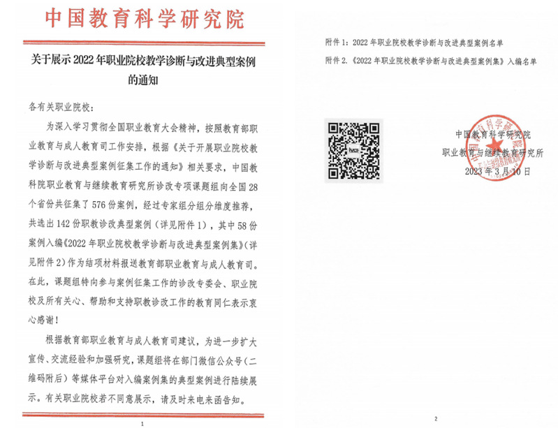 职业院校教学诊断与改进典型案例征集是中国教科院职业教育与继续教育研究所按照教育部职成司相关工作要求而开展,旨在深入贯彻全国职业教育大会精神,落实《关于推动现代职业教育高质量发展的意见》等有关要求,以积极推进职业院校教学诊断与改进工作创新发展,此次入选典型案例充实体现了近年学校在深化新时代教育评价改革和完善内部质量保证体系等方面的改革成果。