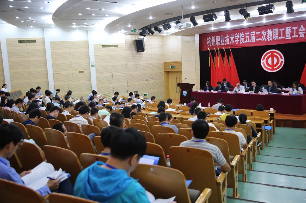 66614日,杭州职业技术学院五届二次双代会在行政楼报告厅隆重举行。我校党委班子成员安蓉泉、贾文胜、张洪宪、许淑燕、陈泉淼、陈加明、金徐伟、麻朝晖出席会议。来自全校各学院、部门的一百多名代表齐聚一堂,共同参与学校民主管理,依法行使民主权利。特邀代表和列席代表共同与会。
