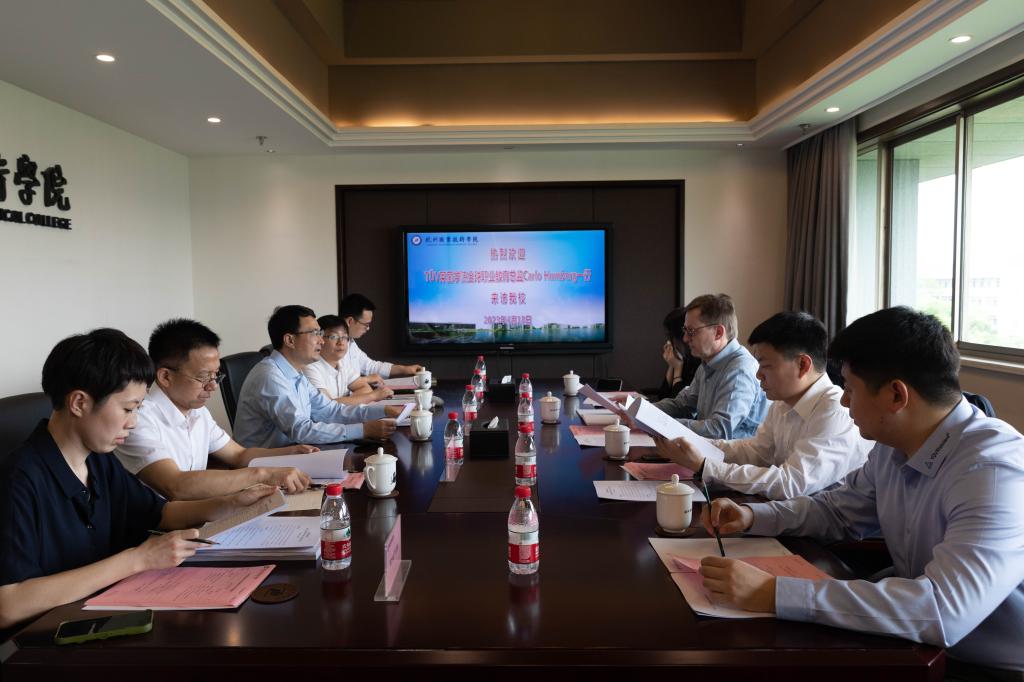 楼晓春对Carlo一行的到来表示热烈欢迎,表示学校将积极推进与德国TUV莱茵学院的合作,通过引入德国优质的教育资源和先进理念,探索本土化“双元制”育人模式,打造校企双元协同育人的浙江样版。Carlo表示,TUV莱茵学院始终致力于以“双元制”模式进行职业教育与培训,学院将持续深化与杭职院的合作,促进产教融合,助力高质量人才培养。随后,双方就合作办学、专业建设、实训基地建设等方面进行了深入的讨论。