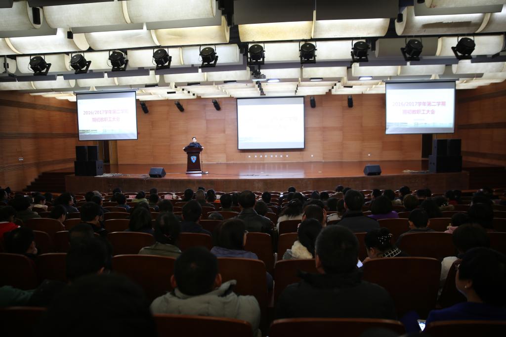 2月18日下午,我校2016/2017学年第二学期期初教职工大会在图书馆报告厅召开。党政领导班子成员贾文胜、张洪宪、陈泉淼、陈加明、金徐伟、麻朝晖出席,全体教职员工参加会议。