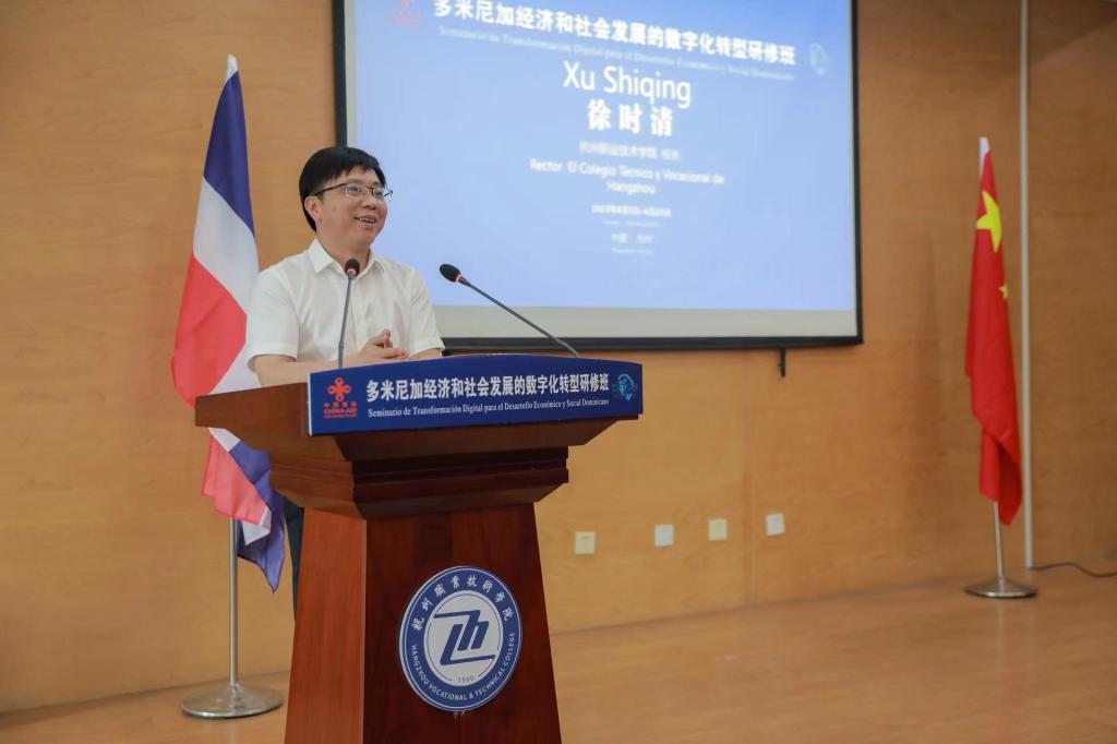 徐时清介绍了杭职院的基本情况,重点介绍了学校国际化发展和援外培训工作的发展历程。他表示,杭职院将充分发挥高职教育优势办好本次研修班。他希望各位官员学习了解中国的数字化转型相关经验,学有所获,也希望此次研修班能成为中国与多米尼加沟通交流的桥梁纽带。