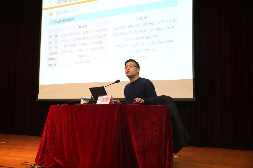 许淑燕作讲座总结。她认为本次讲座指导性强,教师要学以致用,认真思考和修订校级现代学徒制实施方案,要求科研处推出现代学徒制招标课题,理论和实践双管齐下深度推进我校现代学徒制工作。