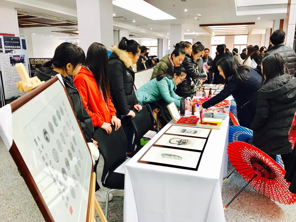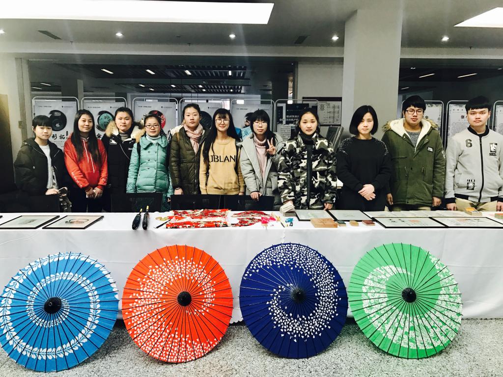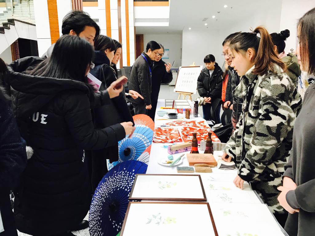 在当天的非遗教学成果展上,五所高校纷纷带来了各校非物质文化遗产的教学成果,不少师生被吸引,展览现场非常热闹。我校的五个非遗项目金石篆刻、雕版印刷、中式旗袍制作、纸伞制作、全形拓都参加了展出,是五所高校中展出项目最多,作品最丰富的。来自非遗班的10名学生,展示了他们的非遗作品,现场展示他们从非遗传承人手中学得的技艺。有的现场小心翼翼地糊纸伞、有的一刀一刀地刻雕板,他们虽然年轻,技艺也不算成熟,但都非常认真。从他们身上,可以看到老一代非遗传承人“工匠精神”的传承。我校的非遗教学成果得到了杭州市教育局领导的高度肯定。