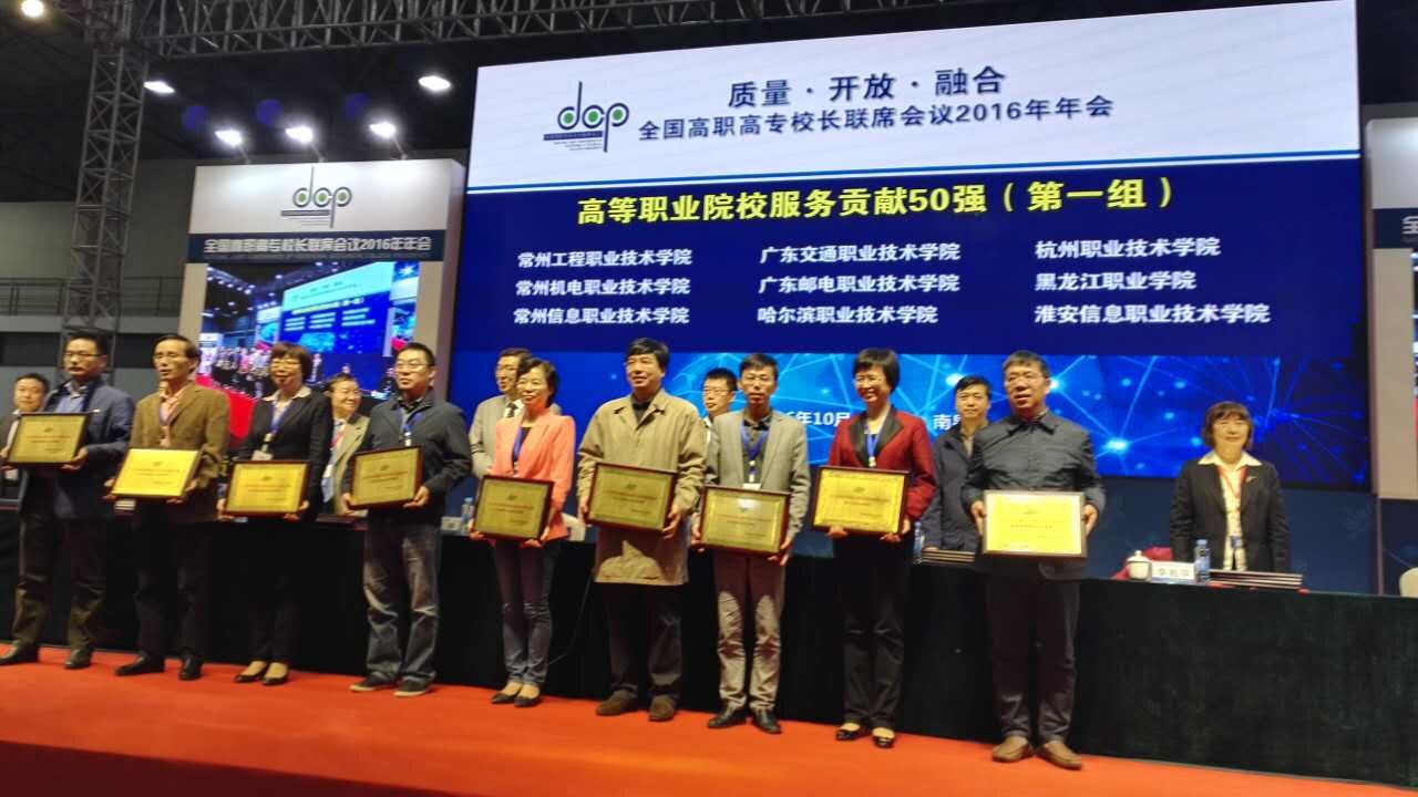 会上举行了全国“高等职业院校服务贡献50强”颁奖仪式。我校作为获奖单位上台领奖。