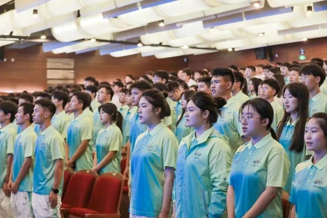 机关党委书记、校工会副主席何霞红作动员领誓。校团委副书记楼黎瑾代表教师领队、达利女装学院桑怡婷同学代表全体志愿者、商贸旅游学院院长张赵根代表二级学院,宣传部部长张杰、保卫部部长郑何敏代表职能部门依次作了表态发言。他们表示,将全力贯彻落实上级要求,牢记担当、不辱使命,高标准、高质量完成各项任务,齐心协力为护航杭州亚运会、亚残运会交出一份完美的答卷。动员大会上还举行了全体志愿者授旗仪式。数位杭州亚运会开幕式学生演员代表一同唱响杭州亚运会主题曲《同爱同在》。