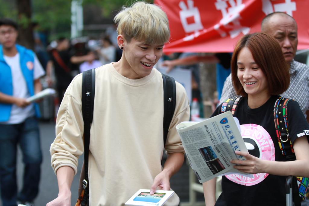 新鲜出炉的《杭州职业技术学院报》受到了新生和家长们的热烈追捧,成为他们迅速了解学校情况的一个渠道。不少新生和家长还在校内的三个服务点里主动扫描关注了学校官方微信,并领到了一份精美的校园风光明信片。