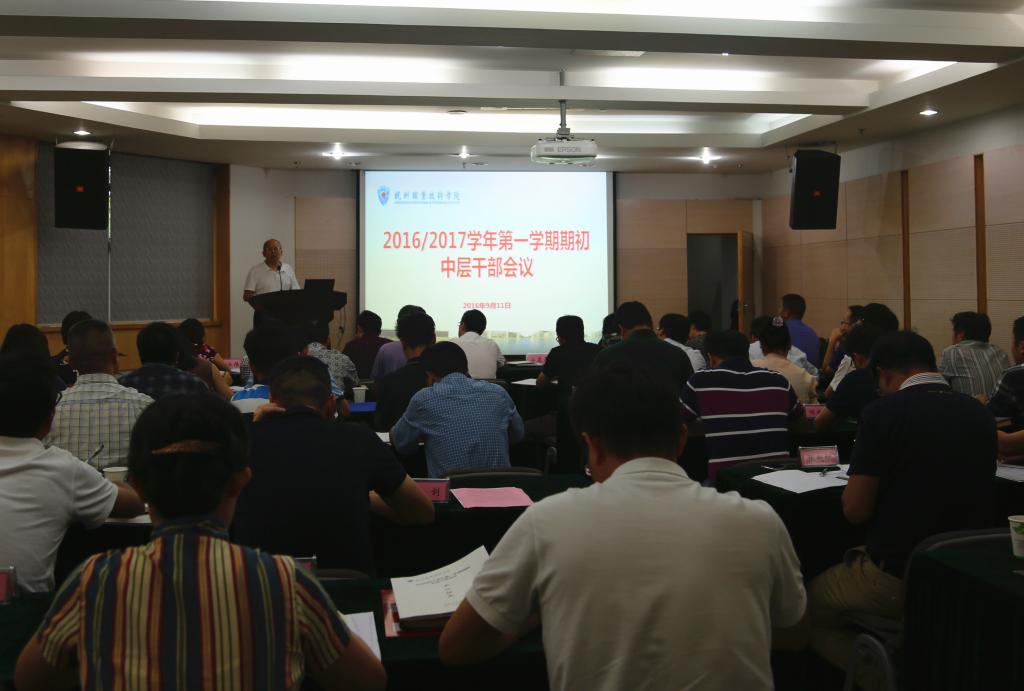 9月11日,学校新学期中层干部会议在行政楼第四会议室召开。学校党政领导班子成员,全体处级干部、资产经营公司负责人,常驻学校的二级学院企业方负责人出席会议。会议由校长贾文胜主持。