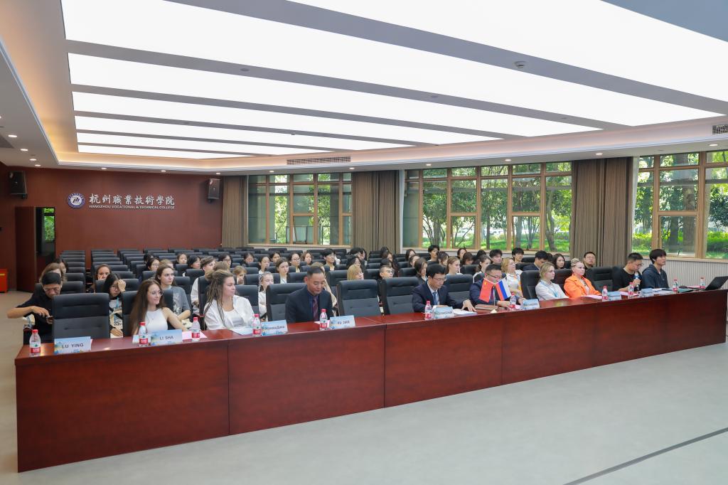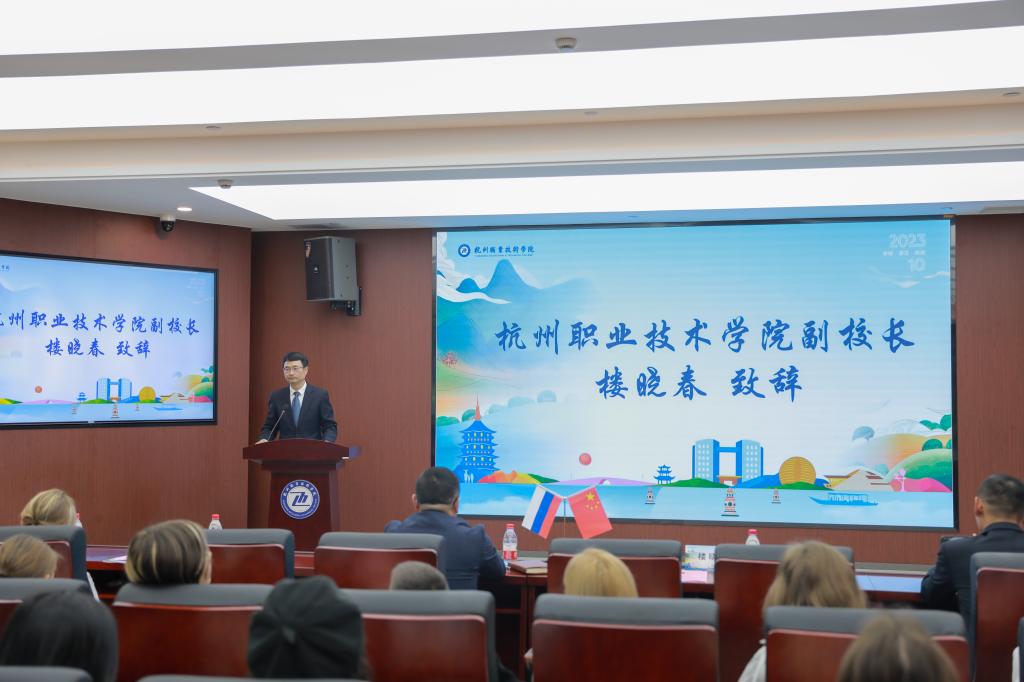2023年10月24日上午, 杭州职业技术学院2023年“魅力杭城 语你同行”俄罗斯汉语游学营开营仪式在行政楼117会议室成功举行。俄中教育协会理事长包长胜,我校副校长楼晓春,国际交流合作处、继续教育学院负责人,以及全体俄罗斯游学营学员、我校师生代表共计60余人出席了开营仪式,仪式由国际交流合作处副处长陆颖主持。
