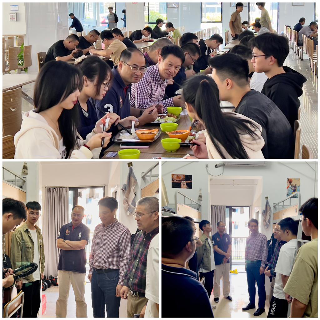 午餐会氛围轻松活跃,高云飞一行向参加群演学生的辛苦付出表示肯定与鼓励,并亲切询问了群演学生,了解学生排练期间和当前生活学习情况,倾听同学们分享学生训练感受和排练趣事。商贸旅游学院党总支书记、院长张赵根赞赏了群演学生们的奉献精神和积极向上的态度,强调了参与本次盛会表演价值和意义,并希望同学们把亚(残)运会精神辐射给更多的商贸学子。随后高云飞和商贸旅游学院相关负责人走访了学生寝室。在寝室高云飞查看学生居住环境,了解学生日常阅读书籍,为学生职业发展提出意见。商贸旅游学院党总支副书记周佳良和副院长袁江军则勉励各位群演学生能把排练中的吃苦精神发挥到日常学习生活中来,在后续的学业舞台上也能大放异彩。