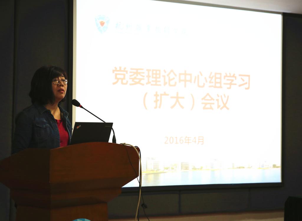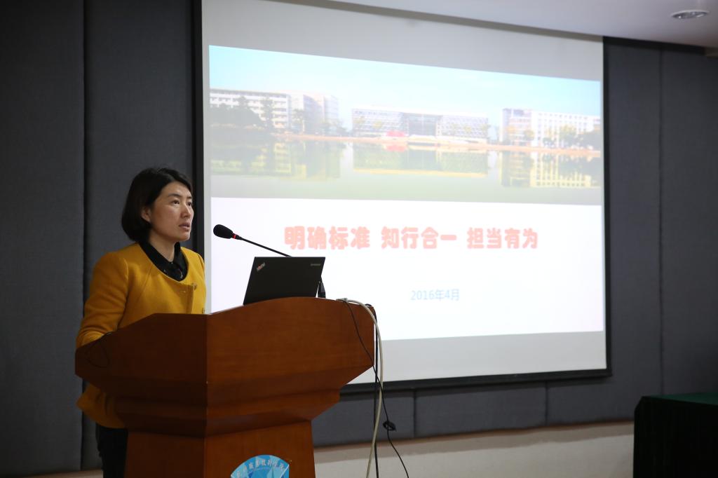 党委委员、组织部长金徐伟以“明确标准 知行合一 担当有为”为题,从“两学一做”是什么、学什么、做什么三个方面进行了解读,同时对我校“两学一做”专题教育活动进行了工作部署。她要求与会人员根据“两学一做”明方向、“三个一”中讲担当的标准,将规定工作与自选动作落实、落细。