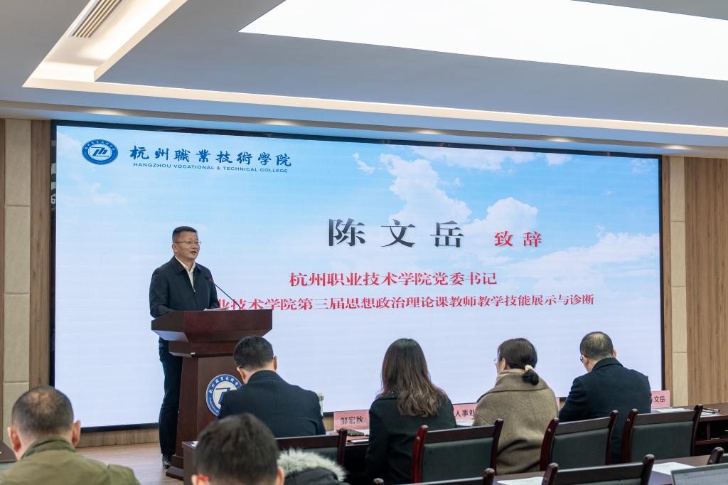 12月20日下午,杭州职业技术学院第三届思想政治理论课教师教学技能展示与诊断活动在明德讲堂举行。校党委书记陈文岳出席活动并讲话,浙江商业职业技术学院马克思主义学院院长张国宏应邀出席并担任评委专家。