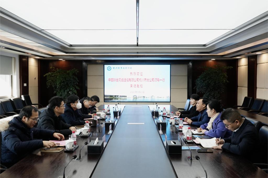 1月24日上午,中国联通杭州市公司党委书记、总经理刘永荣,副总经理柳颖,教育行业部总经理徐微,建德分公司总经理马其峰一行来访学校,校长徐时清出席,办公室、教务处、信息中心和后勤服务中心相关负责人参加座谈交流。