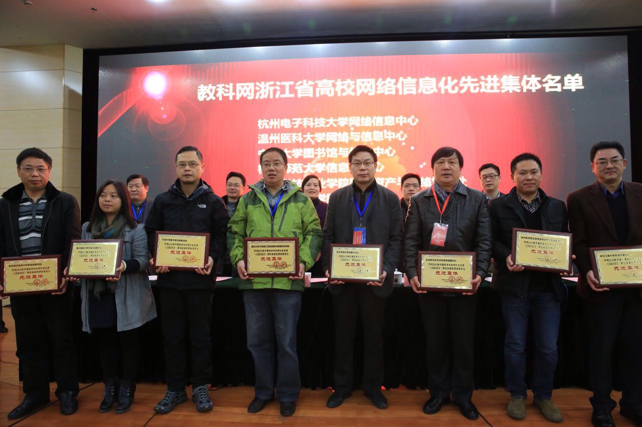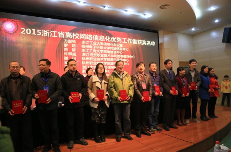 会议表彰了浙江省高校网络信息化工作先进集体和先进个人,贾文胜、徐飞张洪宪、程艳旗、郭晔等领导为荣获表彰的先进集体和先进个人颁发了奖牌和奖状。我校图书信息中心荣获2015年中国教育和科研计算机网浙江省高校网络信息化先进集体,图书信息中心谢川主任、吴伟老师荣获浙江省高校网络信息化先进个人。