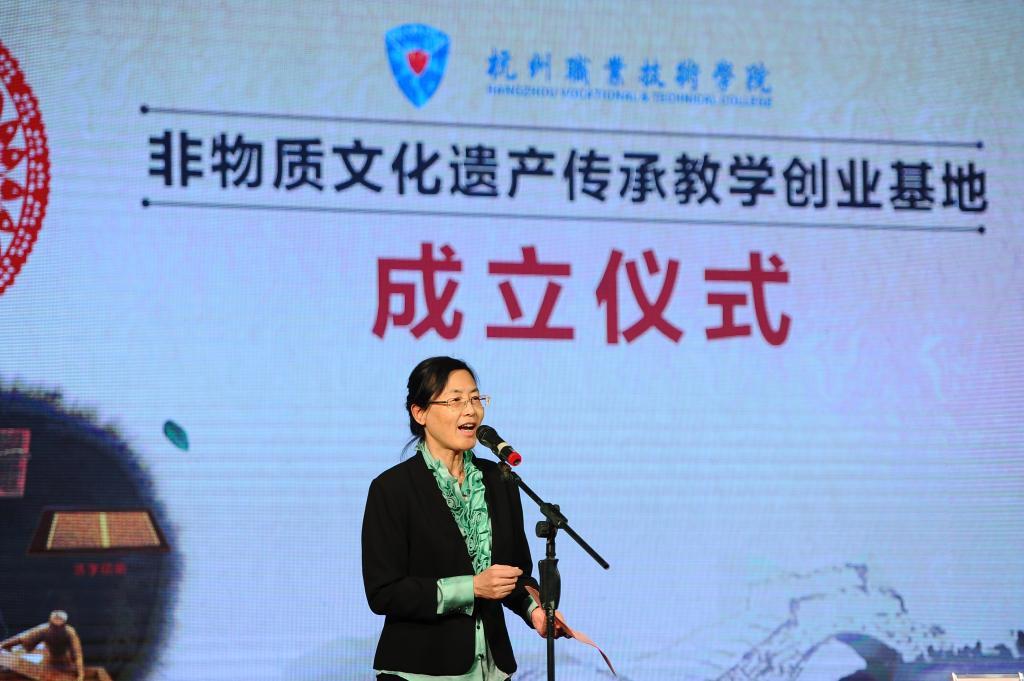 11月11日,杭州职业技术学院非物质文化遗产传承教学创业基地在我校正式挂牌成立。杭州市副市长陈红英,杭州市委宣传部常务副部长、西泠印社党委书记、西泠印社社委会主任杨志毅,浙江省非遗保护中心主任裘国樑等领导,“非遗”传承人刘江、黄小建、闻士善、屠燕治、韩吾民,以及我校党委书记安蓉泉、校长贾文胜等人出席基地成立仪式。