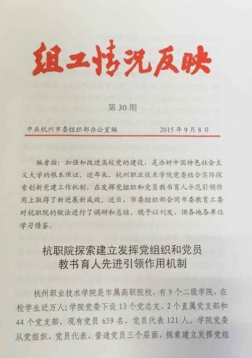 《组工情况反映》编者按指出:“加强和改进高校党的建设,是办好中国特色社会主义大学的根本保证。近年来,杭州职业技术学院党委结合实际探索创新党建工作机制,在发挥党组和和党员教书育人示范引领作用上取得了新进展新成效。近日,市委组织部会同市委教育工委对杭职院的做法进行了调研和总结,现予以刊发,供各地各单位学习借鉴。”